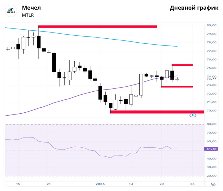 Акции реализовали сценарий роста с целями 74–74,2. Максимум установлен на отметке 75,44. Затем появилась реакция продавцов. На следующей неделе следим за выходом цены из диапазона 72,75–75,44, так как вероятность движения в текущей точке равнозначна в обе стороны.